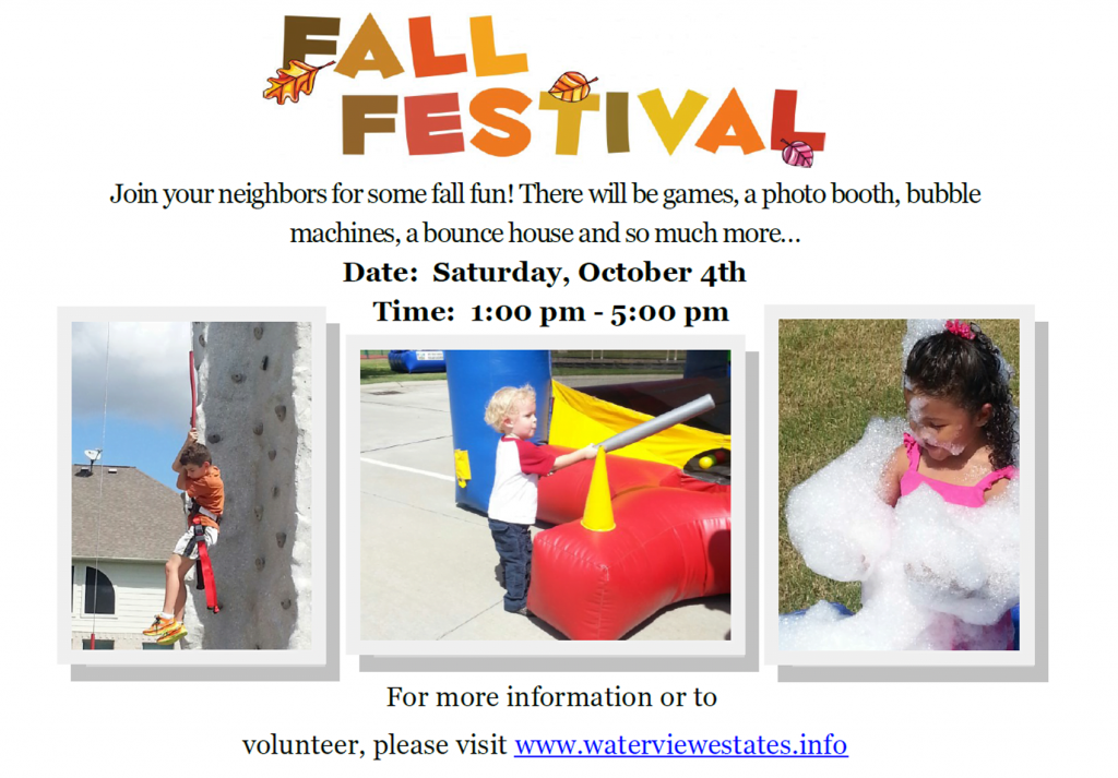 Join your neighbors for some fall fun! There will be games, a photo booth, bubble machines, a bounce house and so much more… Date: